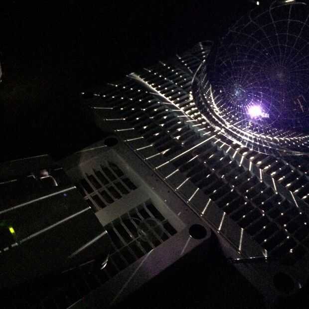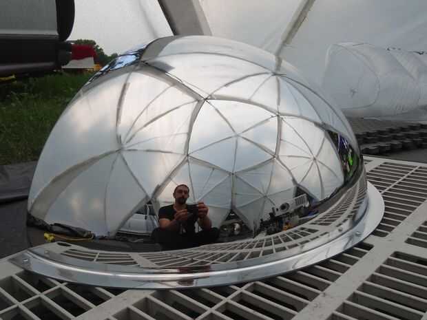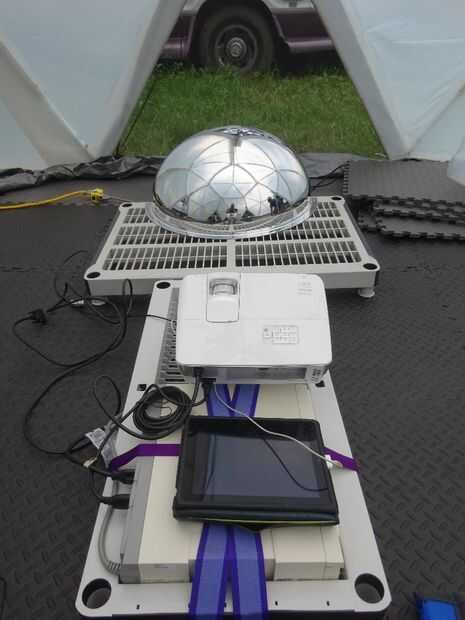 El espejo debe ser ligeramente dentro de la cúpula para brillar en todo. Hemos construido una plataforma de unos estantes de plástico que teníamos alrededor. Fue bueno poder atornillar el reflector y los soportes de proyector a objetos rígidos que eran todavía movibles.