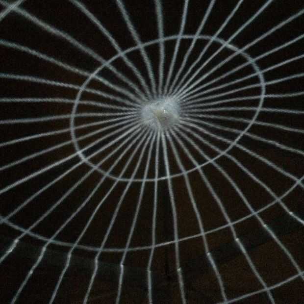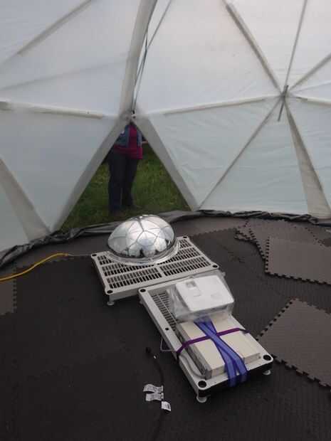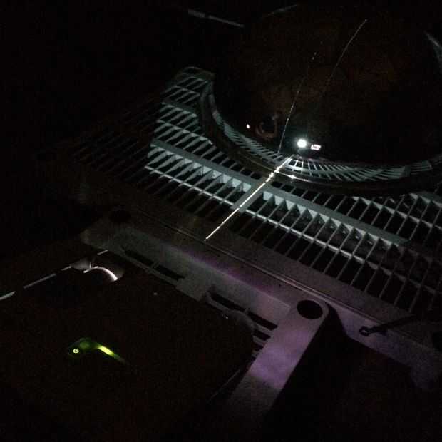 El reflector que tiene tres orificios: uno en el centro y una a cada lado. Esto hizo fácil alinear horizontalmente el proyector mediante la proyección de una línea centrada (modo L en el software Lib cúpula que escribimos). Entonces podríamos centro la proyección en la parte superior del techo de la cúpula mediante la proyección de una cuadrícula polar (modo de G en el software).