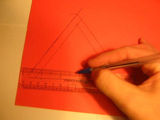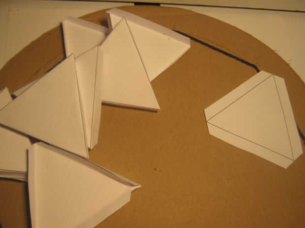 Paso 1 - utilizando los cálculos les marcan en la tarjeta. Me encontré con una regla tardó demasiado así que decidí imprimir los triángulos en su lugar. (Recuerde extender por 1cm para las pestañas pegamento)