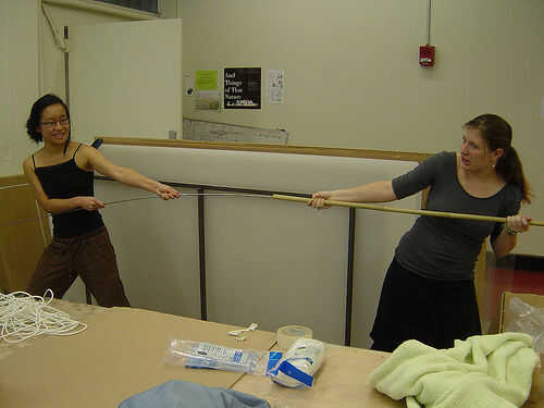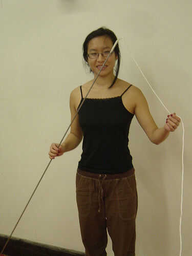 Cuerda la cuerda de nylon en los tubos de bambú con la ayuda de una varilla larga de metal. (Cinta de la cadena hasta el final de la varilla de metal.)