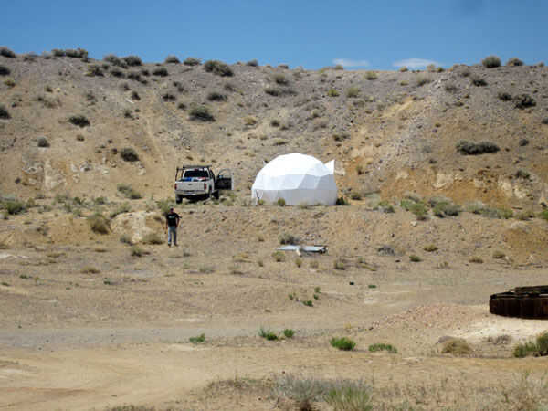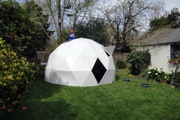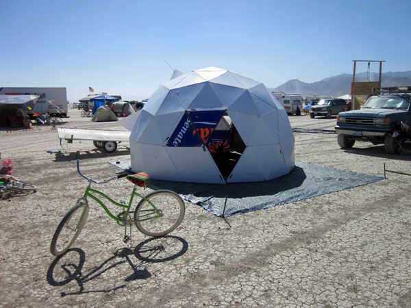 El domo ventila bien y no calor en el sol debido a la alta reflectividad del exterior blanco. Con los altos lados es permanente en la mayor parte del interior. Más de suficiente espacio para colchón de aire de la reina y una mesa. La luz que se filtra a través del azul y el naranja da una calidad de vidrieras en el interior. Uso de coroplast blanco puro sería un interior realmente brillante.