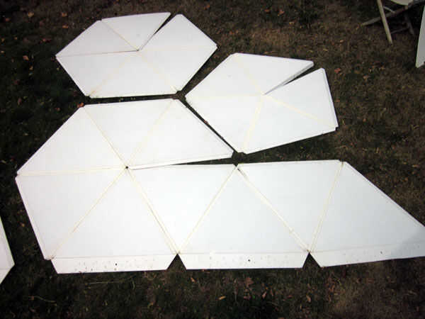 La cúpula se compone de 3 segmentos plegables básicos: un Pentágono (5 triángulos), un hexágono (6 triángulos) y un "hexágono plus 3" (9 triángulos de la fila base). Cada segmento se desarrolla y se recorta en una forma convexa con binder clips o una abrazadera de tubo de pvc.
