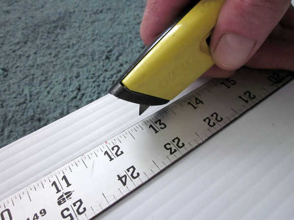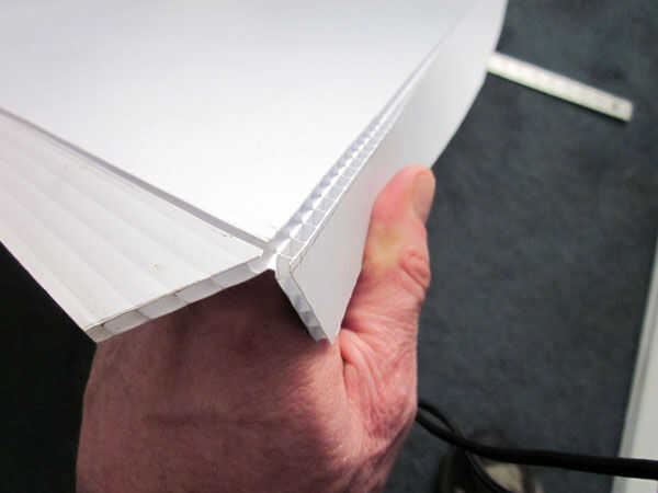 Coroplast tiene dos pieles conectadas por las costillas finas como cartón. Cortar los triángulos utilizando una navaja y borde recto. Esto hizo fácil producción sin herramientas reales. Pestañas con bisagras con el coroplast son fáciles - sólo cortar una cara de la hoja con una maquinilla de afeitar bajo y doblan espalda con la otra cara como la bisagra. Las lengüetas conectan junto con clips binder grande durante el montaje.