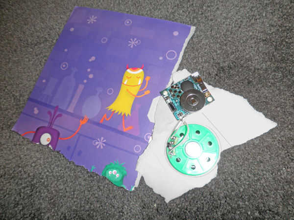 Comprar una tarjeta barata cantar. RIP a la derecha para revelar el altavoz. Use una tijera para cortar los cables conectados al chip de memoria y sonido. Tomar el altavoz de la cinta que es presionado. Tire de los cables de los altavoces.