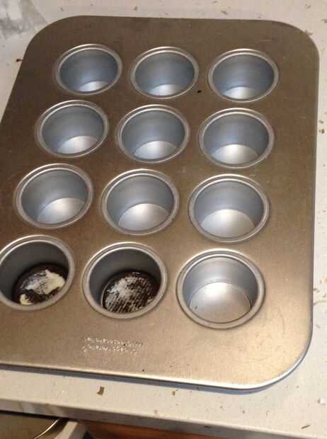 Separar la galleta de chocolate en dos mitades y colocar uno en la parte inferior de cada cavidad de un molde de mini tarta de queso. Si no tienes una sartén mini tarta de queso, puede usar un molde de cupcake normal.
