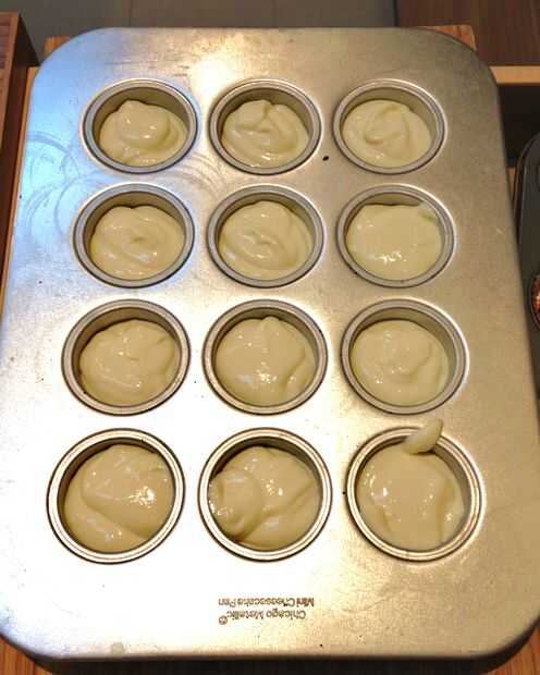 Llenar las cavidades con la mezcla de cheesecake y colóquelos en el horno para hornear de 23 a 30 minutos o hasta que los centros son firmes.