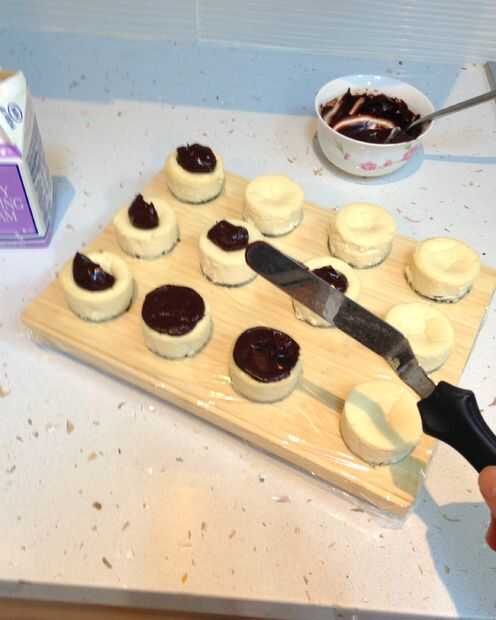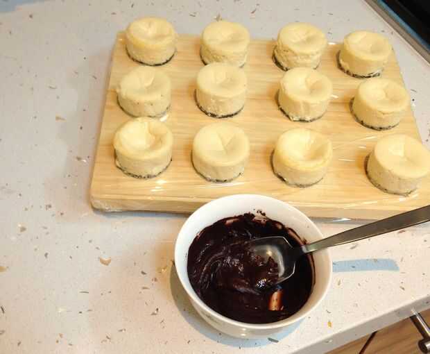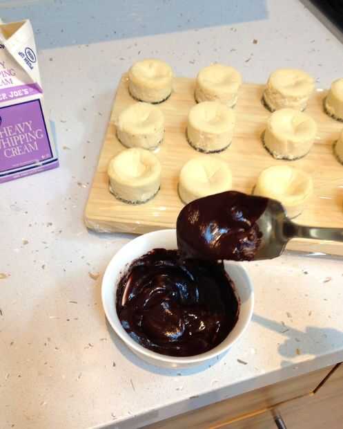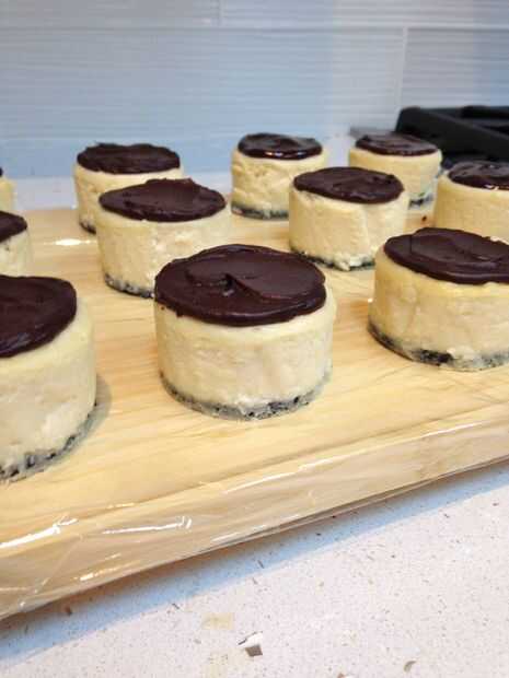 Para hacer el ganache, mezcle crema y chocolate juntos en un recipiente de microondas seguro y poner en el microondas durante 15 segundos. Revolver y poner nuevamente en el microondas durante 5 segundos. Continuar este ciclo hasta que la ganache es lisa. Coloque un blop de ganache en cada pastel de queso y use una espátula offset para suavizar la ganache. Deberás acabar con una docena de queso blanco y negro pequeño. Poner en la nevera hasta que esté listo para montar y servir.