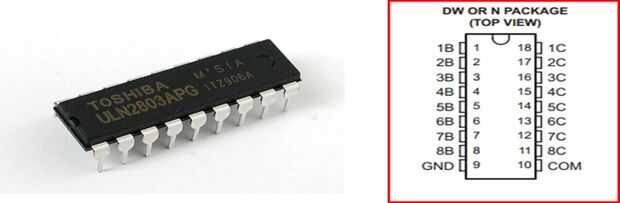 Usos del ULN2803a incluyen controladores de relé, conductores de la lámpara, etc.. Y eso es lo que necesitamos, relé controlador. El ULN2803A tiene un resistor de base la serie 2.7-kΩ para cada par de Darlington que hace operables directamente con TTL o 5 V CMOS dispositivos.