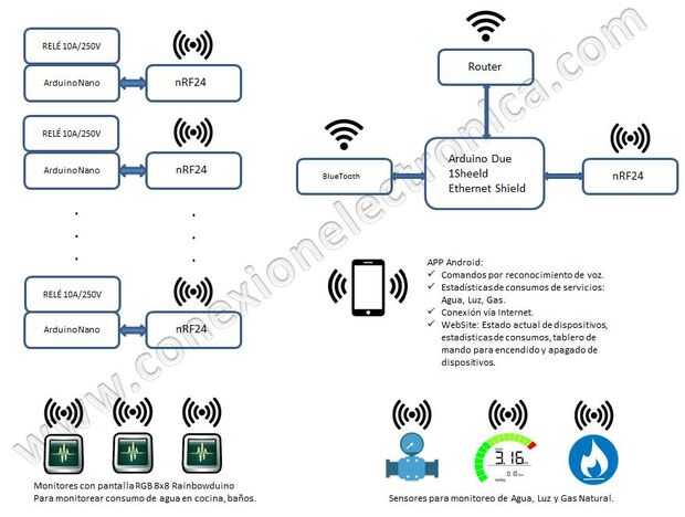 - La central que controla los interruptores, por los momentos la implementado con un arduino UNO + 1Sheeld. Para conectar dicha central a la nube, estoy intentando integrar un módulo Ethernet al sistema.