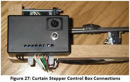 El circuito electrónico fue unido al lado del marco con ataduras de cremallera que pasan a través de los orificios perforados en el cuadro de proyecto para el montaje. Interruptores de límite momentáneo del rodillo fueron montados sobre pequeños soportes en L en ambos extremos de la varilla roscada y cableado de los interruptores fue alimentado a lo largo de la parte posterior del marco y en el cuadro de proyecto. Para llegar a los interruptores de límite con los alambres, los agujeros fueron perforados a través del marco y el cableado a través y soldadas a los contactos del interruptor. Esta configuración mantiene el sistema muy compacto y limpio busca. El cableado de los interruptores de límite se aprecia en la figura anterior, mientras que el montaje del motor se aprecia mejor en la figura 28.