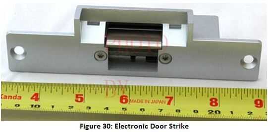 Para este diseño fue elegido un ataque normalmente abierto para que la puerta funcionaría de manera típica sin necesidad de estar conectado a una fuente de alimentación. La puerta electrónica huelga medidas 160 x 25 x 28 mm (L, W, H) y se acciona con 12 VCC y 200-450mA.