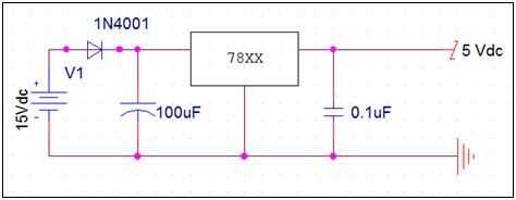 Los circuitos para cada uno de los subsistemas diseñados pueden funcionar fuera de una entrada de 9-12 voltios. El voltaje de entrada se reduce entonces a 5 voltios con un regulador de voltaje LM7805 común. Este es un circuito simple de construir y puede costar menos de $1, incluyendo componentes externos. Dependiendo de la potencia de entrada, el circuito puede requieren un disipador de calor externo, sino que generalmente no para nuestras necesidades de consumo de energía. El 7805 suministra generalmente hasta un amperio de corriente que está más allá de lo que cualquiera de los circuitos de conducción dibujará. Todos los subsistemas siguientes usan este chip con 9 voltios 200mA alimentación para alimentar su a bordo microchips a menos que se indique lo contrario. Una configuración típica de 7805 puede verse en el esquema anterior.