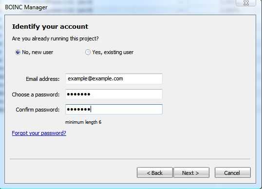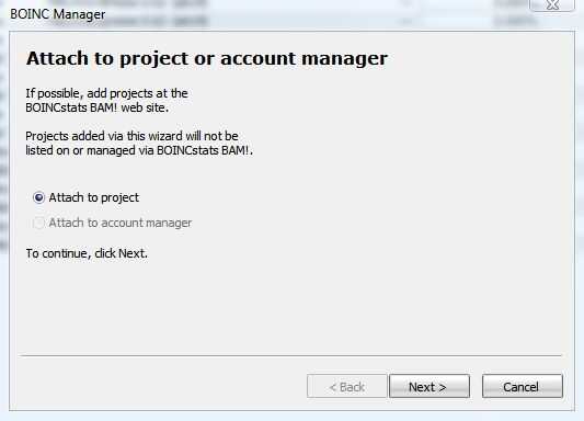 aquí . Como se puede ver, hay muchas opciones. Algunos de los más populares incluyen SETI World Community Grid, y Milkyway pero puede elegir cualquier proyectos que apelan a usted. Una vez haya decidido qué proyectos desea contribuir a iniciar la aplicación BOINC, haga clic en vista avanzada y haga clic en herramientas -> asociar al proyecto o Gerente de cuenta. Seleccione su proyecto de la lista, crear una cuenta y listo! El equipo debe empezar a descargar y ejecutar unidades de obra (WUs).