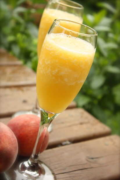 Mezcle los ingredientes en la licuadora y bata en hielo crush ajuste lo suficiente hasta el hielo y los ingredientes se mezclan bien. Vierte en una copa de champán y disfruta. Receta rinde dos bebidas.