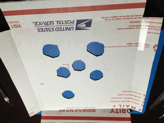 Tomar la cartulina y póngala sobre un panel de su caja de cartón chatarra y traza el interior perímetro de los iconos (círculos y planos) en la caja. Poner la vitrina sobre los mismos y trazar el interior perímetro de la caja en la cartulina. Ahora más o menos cortar la forma de los iconos con un cuchillo de la manía, no tiene que ser perfecto porque nuestra cartulina definirá la forma de que podemos ver en el panel frontal. Cortar el perímetro exterior, dejando algunas aletas para ayudar a asegurar en el interior de la caja.