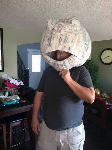 Párpados de cartón, racimos de papel higiénico (porque es fácil de trabajar) para crear el labio superior. Laminado en papel higiénico para crear arrugas en ojos y labios. Cubierta de cinta del conducto para evitar el moho. Luego otro par de capas de papel maché para que sea fuerte.