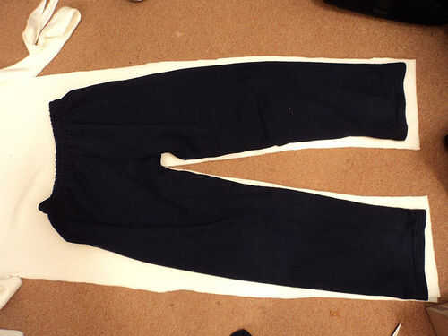 Extienda la tela por lo que se dobla doble. Esta manera, se puede cortar a través de ambas capas y no hacer tanto trabajo. Extienda sus pantalones holgados en la parte superior de la tela y dejando cerca de 1 pulgada alrededor de ella, cortar la forma de los pantalones hacia fuera alrededor de las piernas, pero deja la cintura atada resto de la tela. Además, hacen las piernas unos 16 o 18 pulgadas más largo que los pantalones para hacer pies más adelante (estos pantalones eran bastante largos y terminó trabajando bien, pero asegúrese de dejar esta tela extra para ahorrarse algunos problemas). También, si los pantalones tienen un elástico en la cintura, asegúrese de que usted recortar donde el elástico es cuando se está tumbado, no donde es cuando se está relajado. La tela no estira tanto como el elástico y será demasiado pequeños!