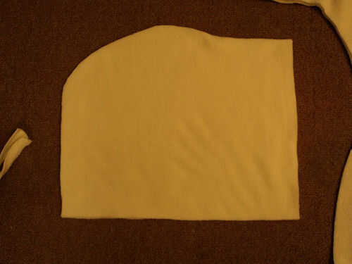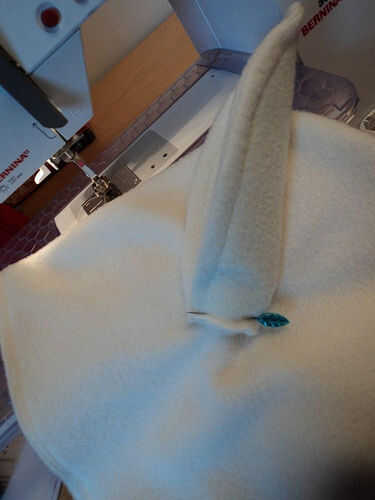 Para las orejas, cortar 4 formas de hoja de la polar y dos de papel rígido. Coser dos de las formas de la hoja para formar un bolsillo y deslizar una de las formas de la hoja de papel rígido en él para ayudar a conservar la forma. Repita esto por lo que tiene dos bolsillos en forma de hoja con papel rígido en ellos. Doblarlas en medio largo maneras de crear la forma del oído. Perno en ambos lados de la parte exterior de la campana y coser a lo largo de la parte inferior. Está bien si ellos flop hacia abajo en la costura, la corona les resistirá. Si realmente queremos que permanezca de pie sus el propios, puede entrar a mano con aguja e hilo y poner unos puntos en cerca de la cima para sostenerlos para arriba.