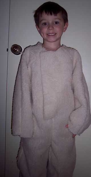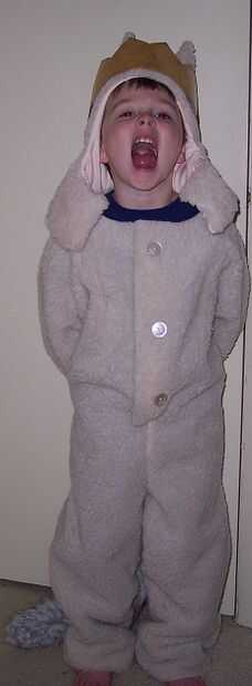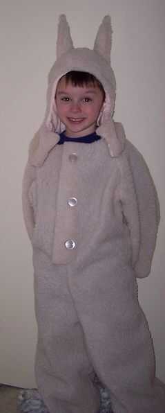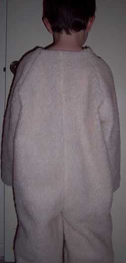 El cuerpo fue hecho usando 5956 cerdo mono perro traje patrón de McCall y alterado de modo que las orejas subieron recto * como orejas de lobo * y también para que pudiera quitarse la capucha. También no agregamos ninguna elasticidad para que el juego no ceñir a la muñeca o los tobillos. Gracias a clima de Virginia fue 82 en Halloween y 62 al día siguiente así lo hizo un montón de sudor. Hemos utilizado una tela woolish comprada en una tienda de tejido local y, lamentablemente, resultó para ser muy pruriginosa ya que no utilizamos un trazador de líneas dentro del cuerpo (pero puso un forro en la campana).