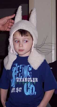 Los bigotes fueron hechos con alambre floral blanco pintado con pintura negra y luego cosidas en la campana.