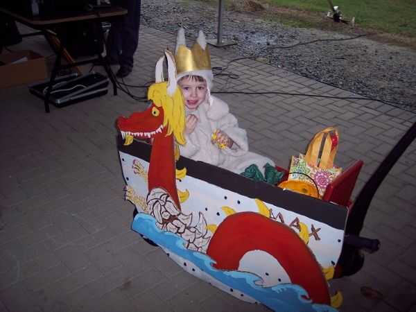 Hemos querido hacer un poco de vieja escuela donde el salvaje cosas son ya que nuestro traje se basó en la película, así que hicimos nuestro carro rojo en un "barco". El monstruo de mar y el barco fue realizado a través de recortes de cartón dibujado a mano y pintado con pinturas de arte comprados en Walmart.
