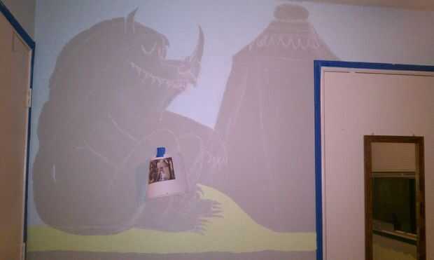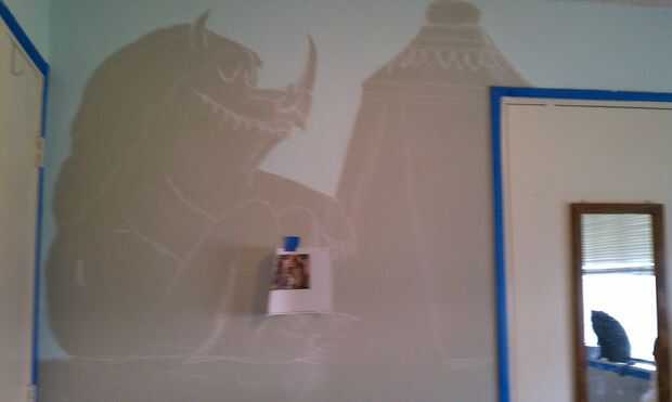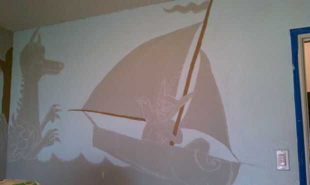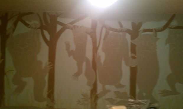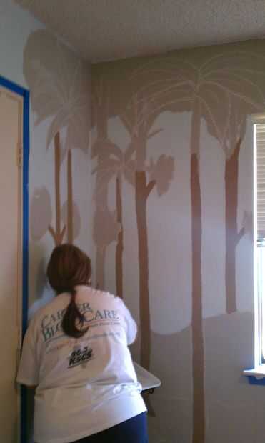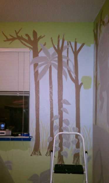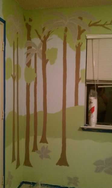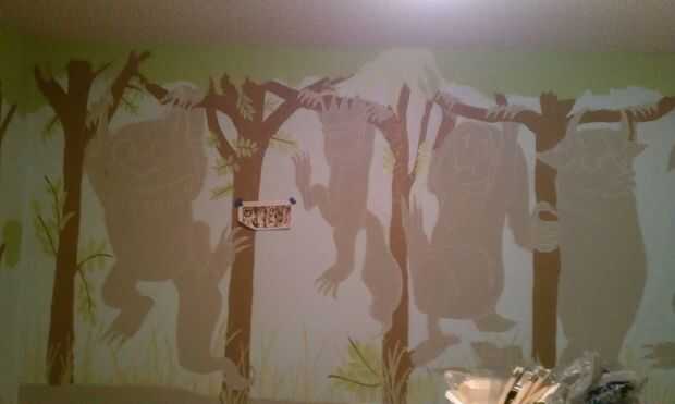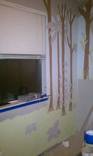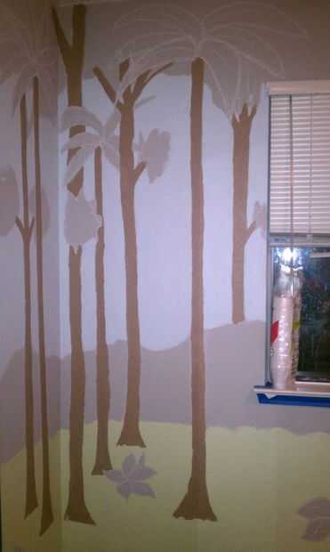 Comenzamos con las grandes áreas para empezar a pintar y dar directrices. Piense en ello como una célula de animación de la pintura. Trabajó con colores base y añadido capas sobre ellos y acaba con las líneas de detalle negro. Estas áreas con que nos afirmó eran el cielo, troncos, hojas y áreas de césped. Hemos sido capaces de utilizar los rodillos y pinceles grandes en áreas de thes.