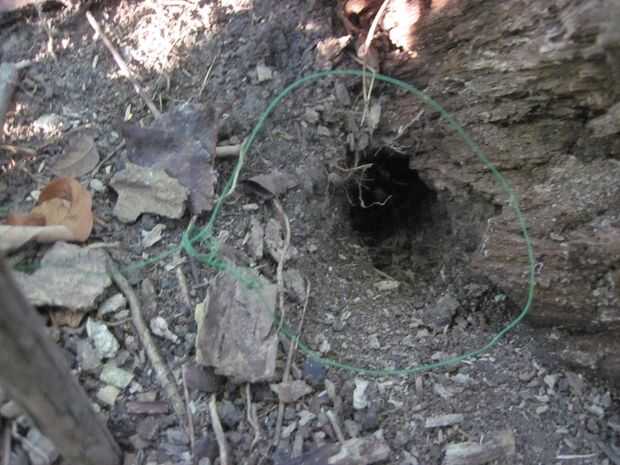 Un agujero en el suelo exterior, scat animal, huellas de animales (en nieve), bellotas o pisoteado césped.