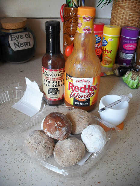 Salsa picante (2 opciones en la foto). Cuanto más caliente mejor! También se podría utilizar una mostaza picante o cualquier otro condimento líquido poco probable ser agradable con los donuts. Ser agradable y mantenerla segura / comestibles.