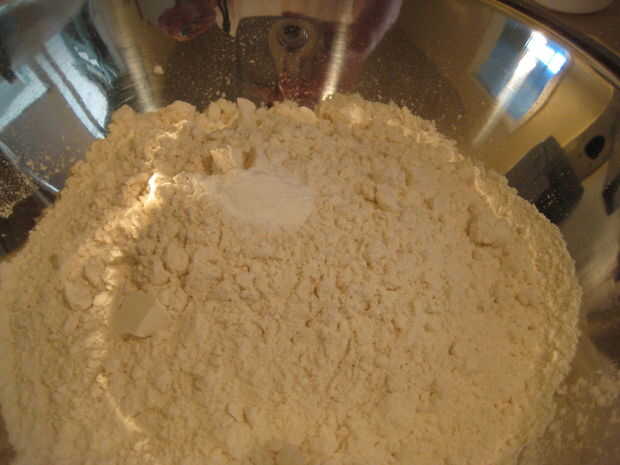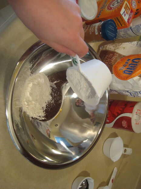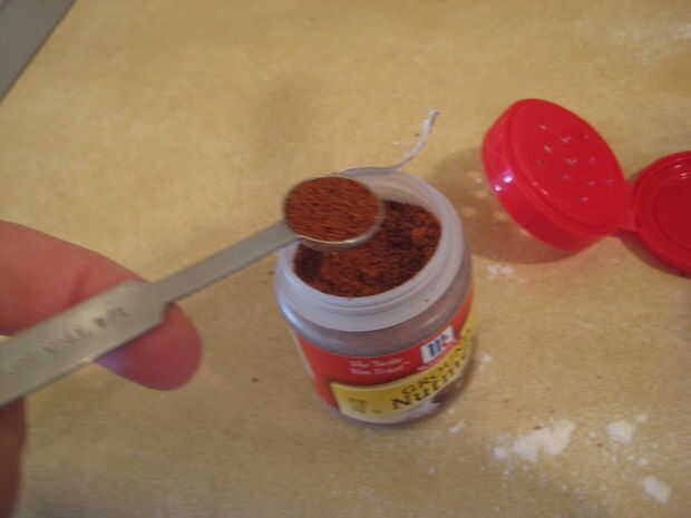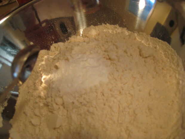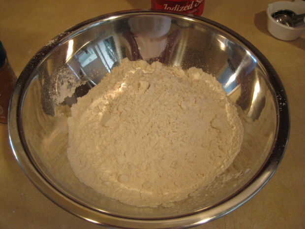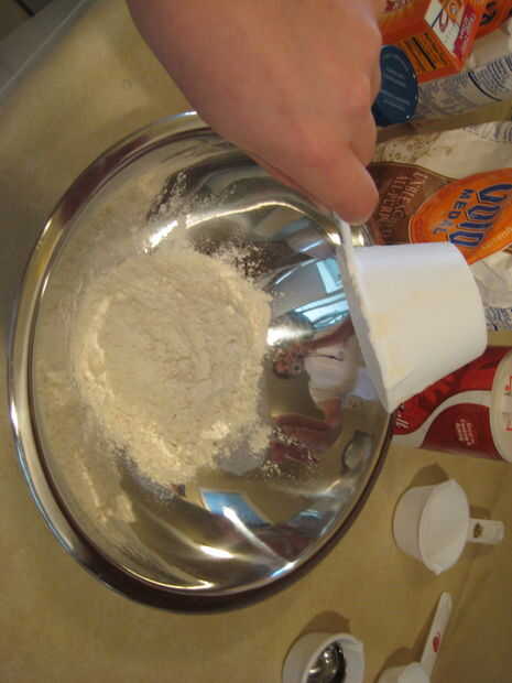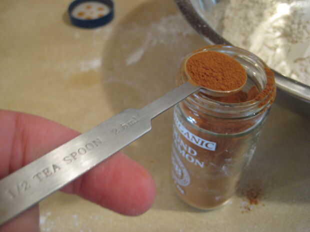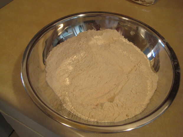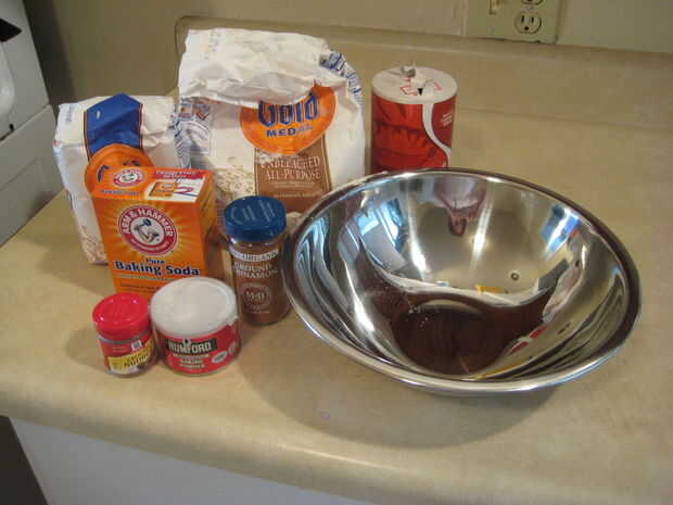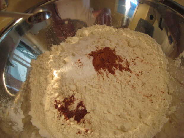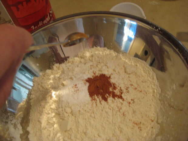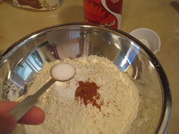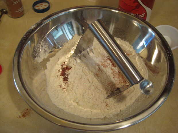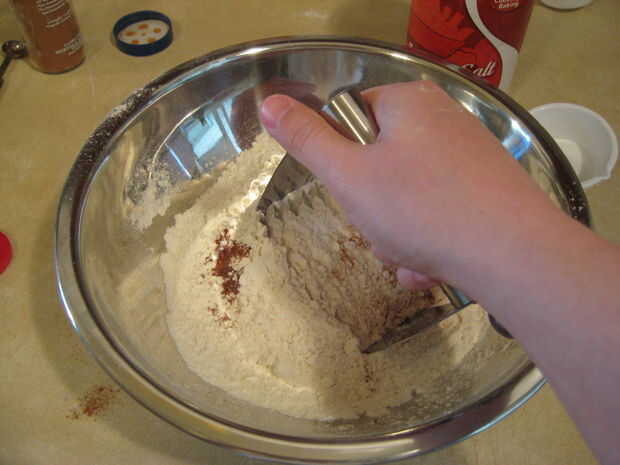 Cierna en un recipiente grande los 3-1/2 tazas de harina, 2 cucharaditas de polvo de hornear, 1 cucharadita de bicarbonato de sodio, 1/2 cucharadita de canela, 1/2 cucharadita de sal y 1/8 cucharadita de nuez moscada.