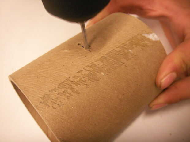 Marque y perfore 2 agujeros en 2 de la parte delantera del tubo alejado separados la misma distancia que los extremos del alambre. Recuerde: ¡ Utilice gafas de seguridad.