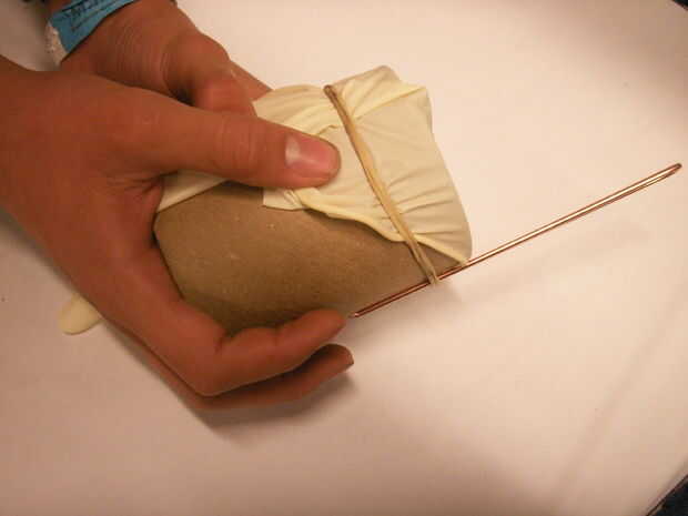 Strech el guante apretado en la parte delantera del tubo y sujételo con una banda elástica. Lugar que los extremos del alambre en los agujeros perforados hacia fuera para que los cables se extienden más allá de la parte delantera del tubo que asegure el cable y garantizar aún más el guante al tubo. Restrech el guante y cortar el Teloslozhenie apagado con las tijeras.