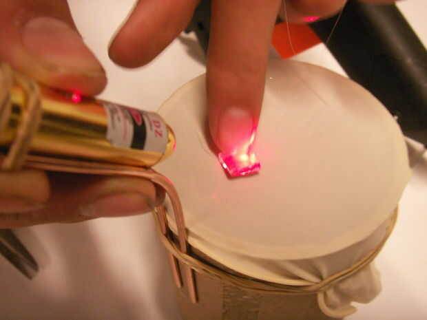 Pegamento (o cinta) el espejo del guante o del globo para que el láser se refleja en el espejo.