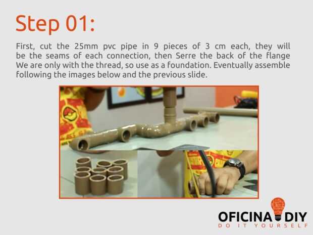 En primer lugar, cortar el tubo de pvc de 25mm en 9 trozos de 3 cm cada uno, serán las costuras de cada conexión, luego Serre la parte posterior de la brida sólo con el hilo, así que use como base. Finalmente montar siguiendo las imágenes de abajo y la diapositiva anterior.