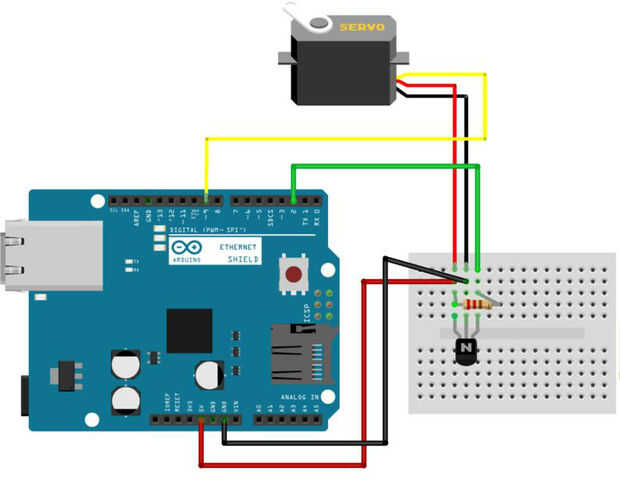 Originalmente era sólo un circuito simple servo, pero decidí añadir el sensor hall a sentido cuando la puerta se abre. Si no utilizas el sensor hall, supongo que el circuito sería mucho menor, ya que no tiene la placa y cables extras y sensor y tal.