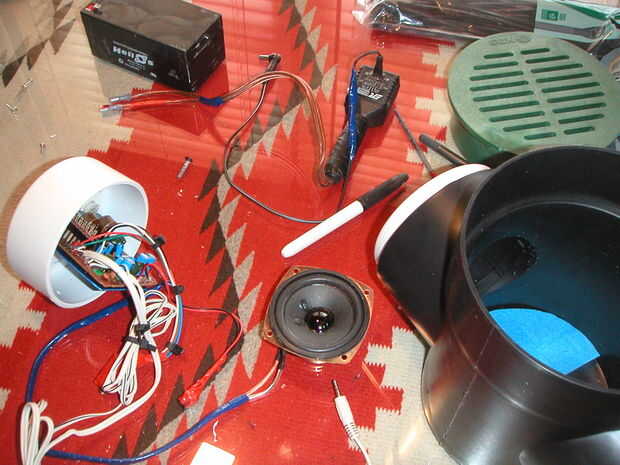 Perforó los agujeros para los controles y poca luz roja de encendido. Montar control y amplificador de interior de la tapa del extremo. Su sostenido en lugar con un pequeño estante plástico. Extendió el cable del altavoz, como voy a ser pull'n de la tapa altavoz para iPod almacenamiento (cabe agradable y apretado-no hay problema con que viene de). También colocar un pequeño pedazo de espuma en la parte inferior de la "T", donde la batería sentará (centro directo).