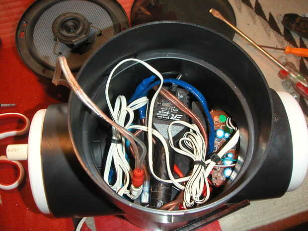 Terminé encima de la tapa del extremo del altavoz y han empujado. El control de amp es en la parte interior de la tapa del extremo y se sujeta con 2 tornillos. He apretado la batería dentro del centro de la "T". He conectado el convertidor de la cig a la batería y conecta el otro extremo en el amplificador (receptáculo de energía de entrada). También he adjuntado una ventaja extra de cada terminal de la batería. Esto es para charge'n. He añadido 2 puestos de charge'n en el exterior de la "T". En el interior, he adjuntado un plomo de cada post. Sólo pop la parte superior y tire hacia afuera el botón spkr. Realizar la conexión de conexión de la batería extra a conexión interior. Simple y eficiente. Hay una salida de auriculares atado amplificador pero no monte a la "T". Tenía una edad, Ronda, spkr que quepa en el centro de la "T". Sweeet! He añadido un cable para el altavoz para facilitar la eliminación. La pantalla altavoz ajuste sobre la parte exterior de la "T", exactamente! Sweeet doble!