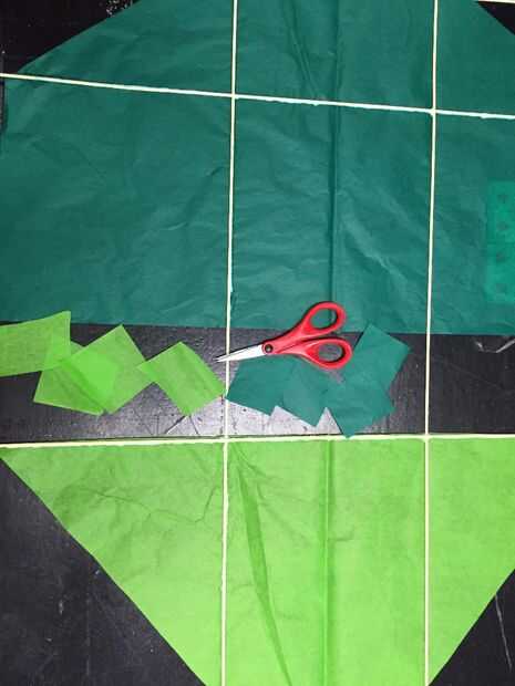 1. Cortar 8 cuadrados de las piezas de chatarra, (4 de cada color).