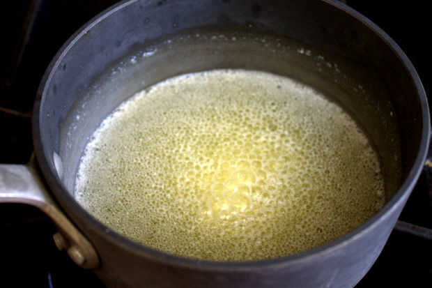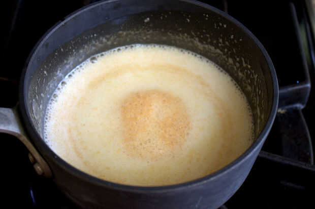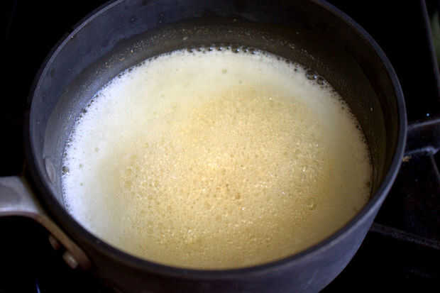 Miralo con cuidado! La espuma se convertirá una agradable blanco/crema de un color tan después de un par de minutos más. Una vez que ocurre, y comienza a oler delicioso y nuez, retire la cacerola del fuego.
