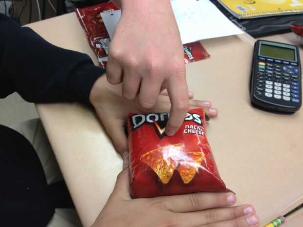 sin reventar la 1 º forma bolsa bolso los doritos en un prisma rectangular llegar la regla y mide los lados de la bolsa (altura, longitud y anchura)