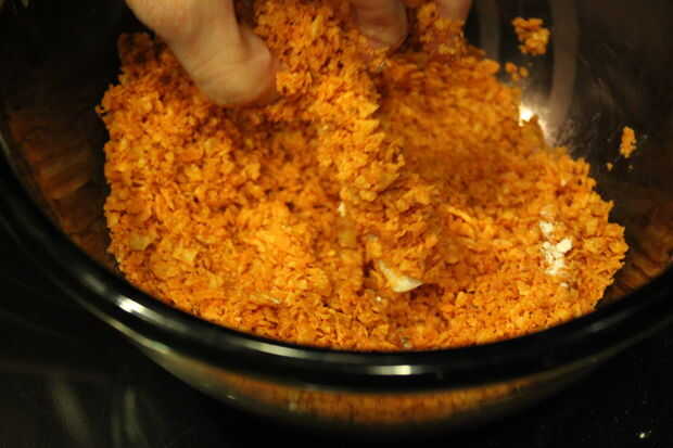 Migas de Doritos son muy gruesas, incluso cuando se desmoronó. Doble maltrato ayudarán a mantenerlos. También, si tienes tiempo, ponerlos en la nevera durante una hora ayudar a sostener las migajas de Doritos. Yo no hice esto porque no necesariamente es necesario basar el tiempo de la Superbowl, su tiempo será limitado. Además, quiero centrarme esta receta en delicadezas en 30 minutos!
