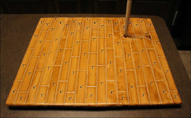 Puesto que el tamaño de la Junta era 21" de alto, me decidí por tablas de 7". He querido alternar las tablas como lo haría en un piso de madera así que a partir de la tabla izquierda delantera, que mide 4 "y un corte con un cuchillo de cocina pequeño el ancho de la duela para marcar el final de esa tabla. Luego de eso Corte mide 7" y hacer otro corte, otro 7" y otro corte, que dejó una tabla 3" va la parte de atrás de la Junta. Lo hice con todas las tablas en un patrón. En todos ellos comencé en la parte delantera y había trabajado mi camino de regreso. Hice 5 tamaños tablón "primeros" y luego sólo había repetido izquierda a derecha. A partir de la tabla izquierda delantera que mide 4" para la primera tabla, la tabla 2 º comenzó con 2", la tabla 3 con 6", la tabla 4 con 3" y la tabla 7 con 7". De cada uno de esos cortes que mide hacia fuera 7" tablas vuelva al final de la Junta.