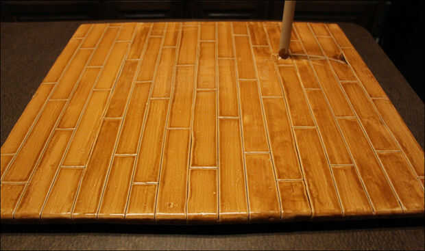 Pinté el piso con un cepillo grande (para cubrir más espacio más rápido) con un lavado de la "pintura" hecho mezclando gel marrón colorante con vodka. Desea usar vodka o algún otro alcohol claro o extracto para pintar sobre fondant, como el agua disuelve el fondant y hacer gomosa.