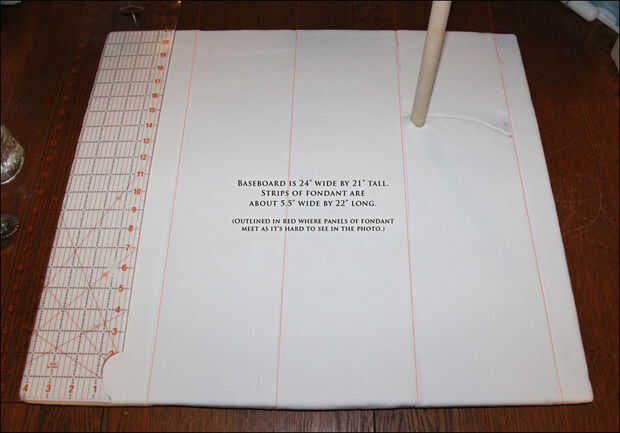 Yo rodé y cortar tiras de fondant de 5.5" de ancho por 22" de largo. Cada tira a la vez, lo hice el fondant no seca mientras se aplica cada tira. Rocíe ligeramente la placa base con el agua de una botella de spray bruma. También puede utilizar un pincel grande o Hilvanado brocha para aplicar agua a la Junta. Usando una mezcla de almidón de maíz y azúcar en polvo al polvo ligeramente la parte superior de la tira, luego enrollar la tira en el rodillo y darle el tablero de la torta. A partir de un extremo de la parte 21", desenrollar la tira de pastillaje (fondant) sobre el tablero de la torta. Asegúrese de que cuelga sobre los bordes para cubrir los bordes. Presione hacia abajo sobre el tablero ligeramente y alrededor de los bordes. Recorte el exceso.