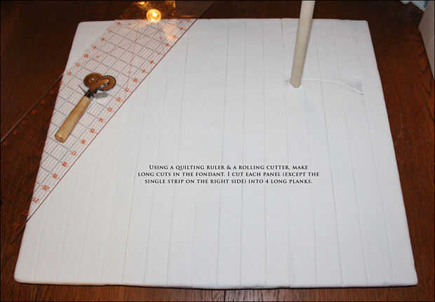 Para hacer el piso de madera que utilicé una regla quilters porque es 24" largo y transparente por lo que hace mucho más fácil cortar en las tablas para el piso, así como más fácil para medir cuando ruede hacia fuera la pasta de azúcar.