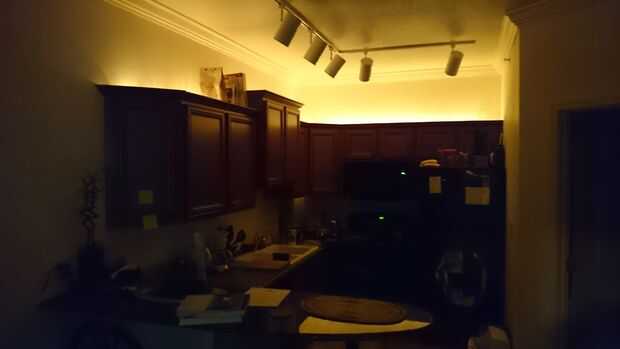 Decidí comprar una cadena de 10 pies de luces blancas de Navidad que está conectado a una salida bastante libre y a través de los gabinetes en la parte superior. Yo entonces simplemente puso hacia fuera a lo largo de la parte superior de los gabinetes. Sin herramientas, sin problemas y barato! Aquí está un par fotos de cómo se comparan con la iluminación normal.