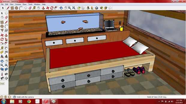 Esta es la única configuración para dormir, permitiendo almacenamiento máximo. Conducen a la plataforma de la cama es escaleras alfombradas. La cama está hecha de un marco de madera con espacio debajo para zapatos o zapatillas y construida en cajones para la ropa, así que no hay un aparador ocupando espacio. Conectado al marco de la cama es una mesita de noche Counter-type con un sostenedor de taza para tomar una copa y los cajones más. La pecera es sólo un ejemplo de algo que podría ir en la parte superior.