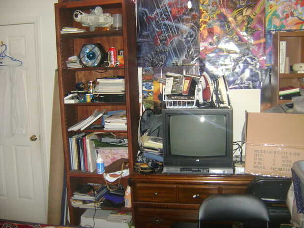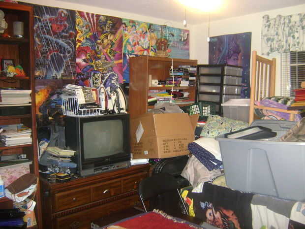Esta habitación se ha convertido en un retén de todos. Tenemos suerte de poder ver la cama. Tenemos un bastidor casero junto a la ventana, para guardar cajas de cómics... Sí... 18 cajas de cómics. Estamos en una casa sin un montón de área de almacenamiento. Es la casa decoraciones, juguetes, libros, cajas y nuestras viejas consolas de juegos. ¿Cómo se lo siempre organizarse? ¡ Ayúdanos, Ikea!