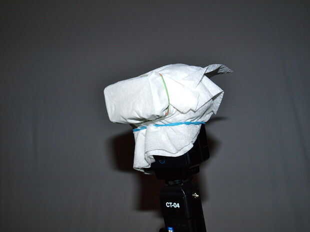 Difusores de suavizan la luz, esto hace que para las sombras más suaves, más estético de la fotografía. Hay un montón de instructable en la fabricación de difusores. Tengo pensado en hacer algún día una... Pero por ahora, usar un pañuelo de papel y algunas bandas elásticas.