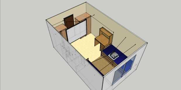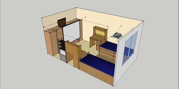 Todo excepto el proyector en el modelo fue creado desde cero, incluyendo el escritorio, cama, gabinete, comando ganchos, etc.. Este modelo es una réplica 1:1 de mi sala real.