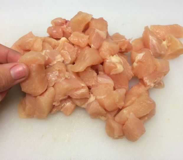 Cortar la pechuga de pollo en cubos tamaño bocado.